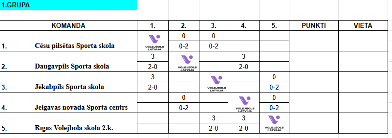 | 13.00 | Daugavpils Sporta skola | VS | Jelgavas novada Sporta centrs | 2-0 | 25-15;25-11 |