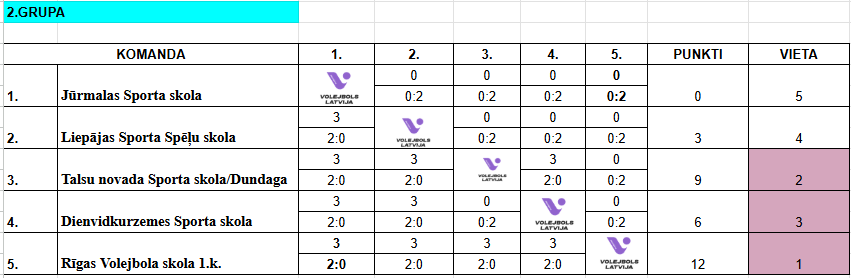| 14:00 | Talsu novada Sporta skola | VS | Rīgas Volejbola skola 1.k.(G.V.) | 0:2 | 22:25; 21:25 |