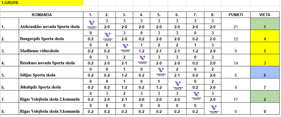 | 15:00 | Aizkraukles novada Sporta skola | VS | Rēzeknes novada Sporta skola | 2:0 | 25:10,25:9 |