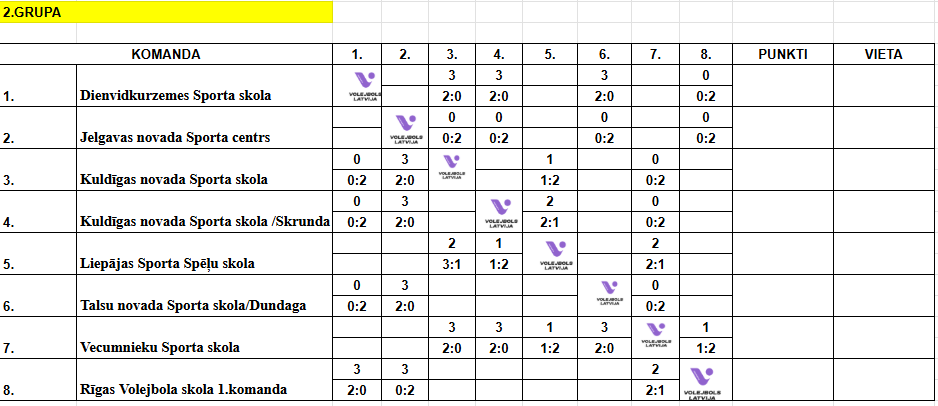 | 12.00 | Kuldīgas novada Sporta skola/Skrunda | VS | Rīgas Volejbola skola 1.kom. | ||