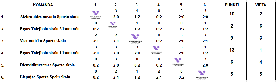 | 14:00 | Rīgas Volejbola skola 1 (J.J.) | VS | Aizkraukles novada Sporta skola | 2:0 | 25:18,25:21 |