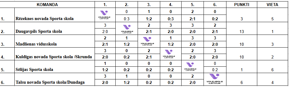 | 11:00 | Talsu novada Sporta skola/Dundaga | Daugavpils Sporta skola | 1:2 | 25:20; 12:25; 7:15 | |
